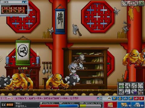 其实进去第7层后马上换线就会到达下图的安全点……注意的是刚换进这个地图的时候可能会给头上那层橱窗的小金人碰下来(小金人触碰伤害2400左右)……补个血马上跳上去就可以了(图中那层橱窗的位置小金人金和尚都碰不到)……小心操作的话地面的金和尚根本碰不到你分毫……然后点画卷进去就行了……不用打金和尚……………………
